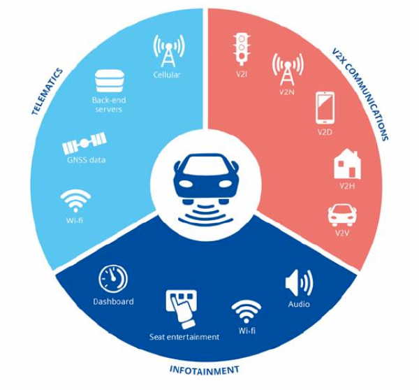 This data used to be processed and stored locally in the car. The growth of vehicle networking capabilities now allow cars to interact between themselves as well as with any other entity (V2X), such as traffic infrastructure (e.g. traffic lights), the vehicle manufacturer, other third-party service providers and other devices (e.g. smartphones), hence the name: “connected cars”. Some examples of connected car applications allow for remote control and diagnostics, mandatory notification of emergency services in case of an accident or assistance in finding available parking spaces.